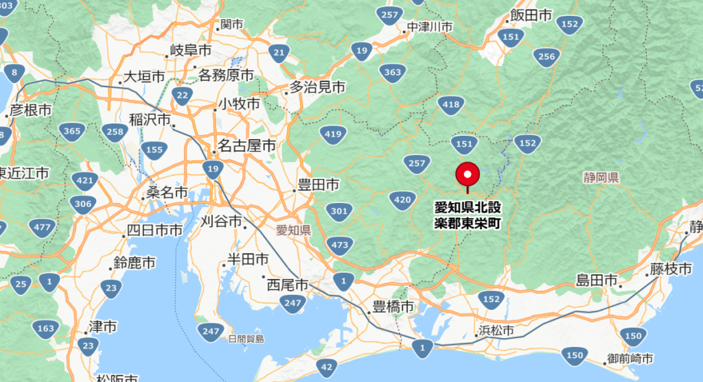 愛知県東栄町は静岡県に近い位置にあり、名古屋市からは1時間半~2時間程度。